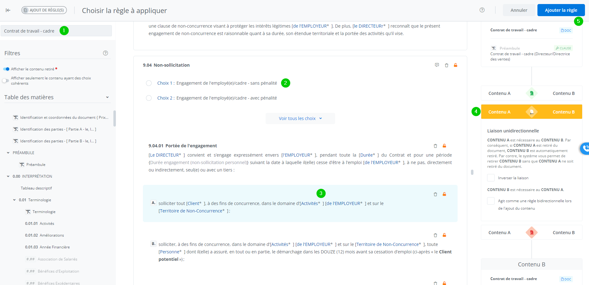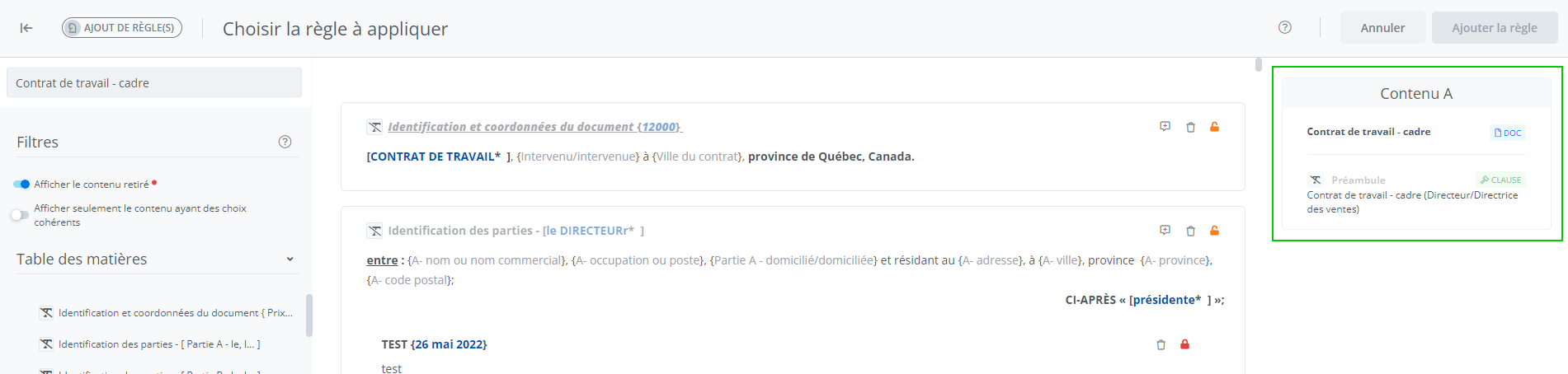 Cet affichage permet d’ajouter une règle à une clause/annexe/paragraphe dans un document.