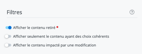 Lorsque le filtre Afficher le contenu retiré est activé, les contenus retirés sont affichés à l’écran. Il faut désactiver le filtre pour cacher les contenus retirés.