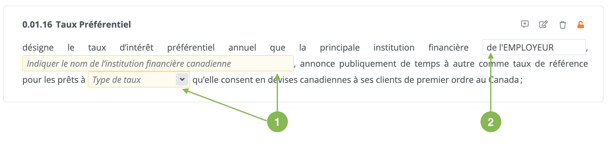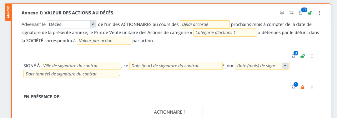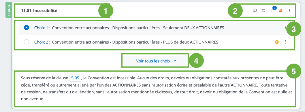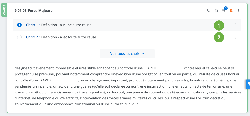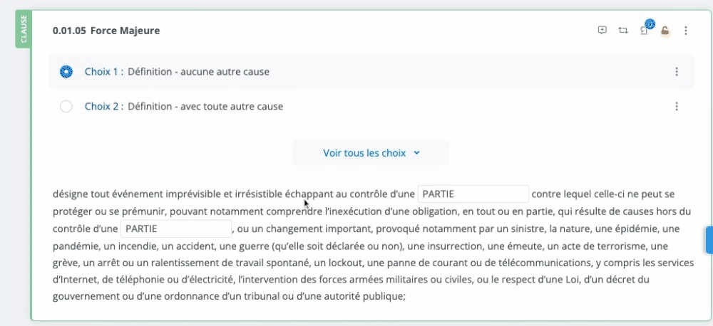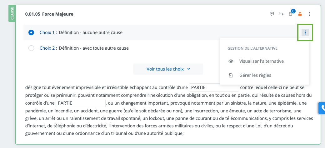 Les alternatives peuvent être présentes dans certaines clauses ou annexes. Ces choix constituent différentes versions du même contenu et peuvent être sélectionnés selon le contexte du dossier.