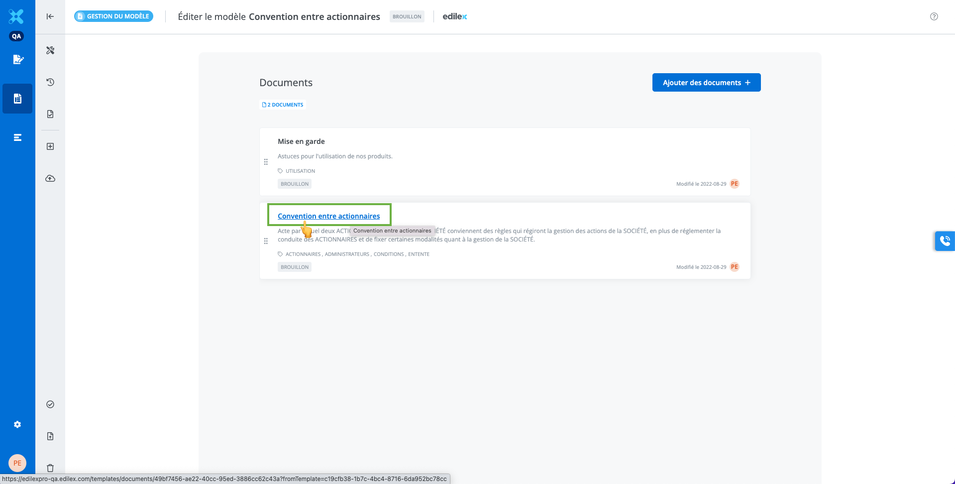 La fenêtre de rédaction de document est accessible à partir de la gestion du modèle, en cliquant sur le titre de la tuile.
