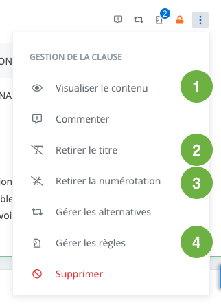 Visualiser la clause dans un autre onglet : permet d’ouvrir la version publiée ou en brouillon de la clause dans un autre onglet.
