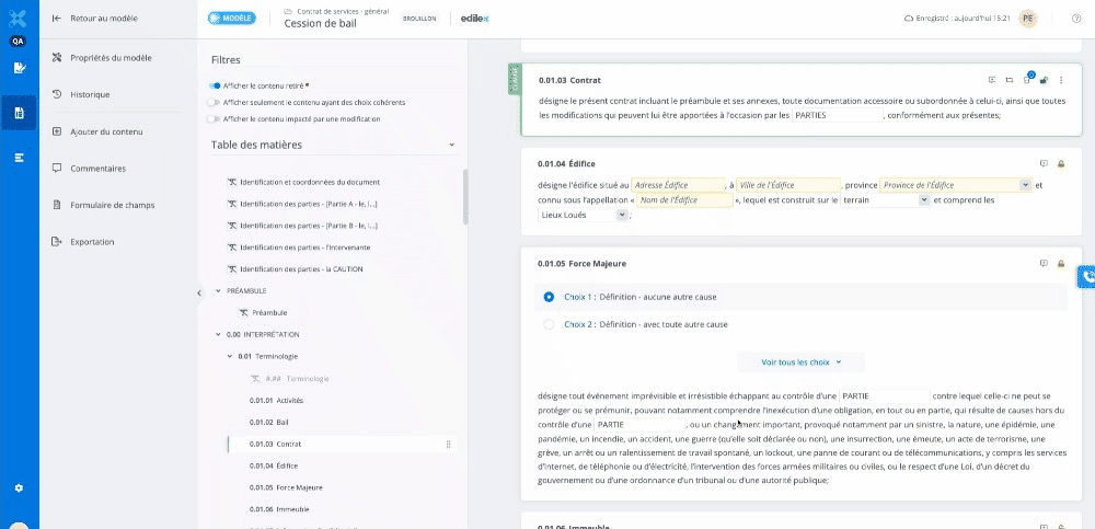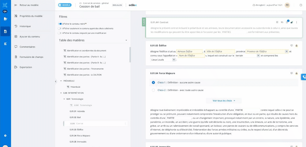 La fenêtre de rédaction permet d’adapter le document au contexte du client en faisant des choix, en remplissant des champs, en ajoutant et en retirant des contenus. Cette fenêtre sert à générer un document en format Word ou PDF une fois la rédaction terminée.