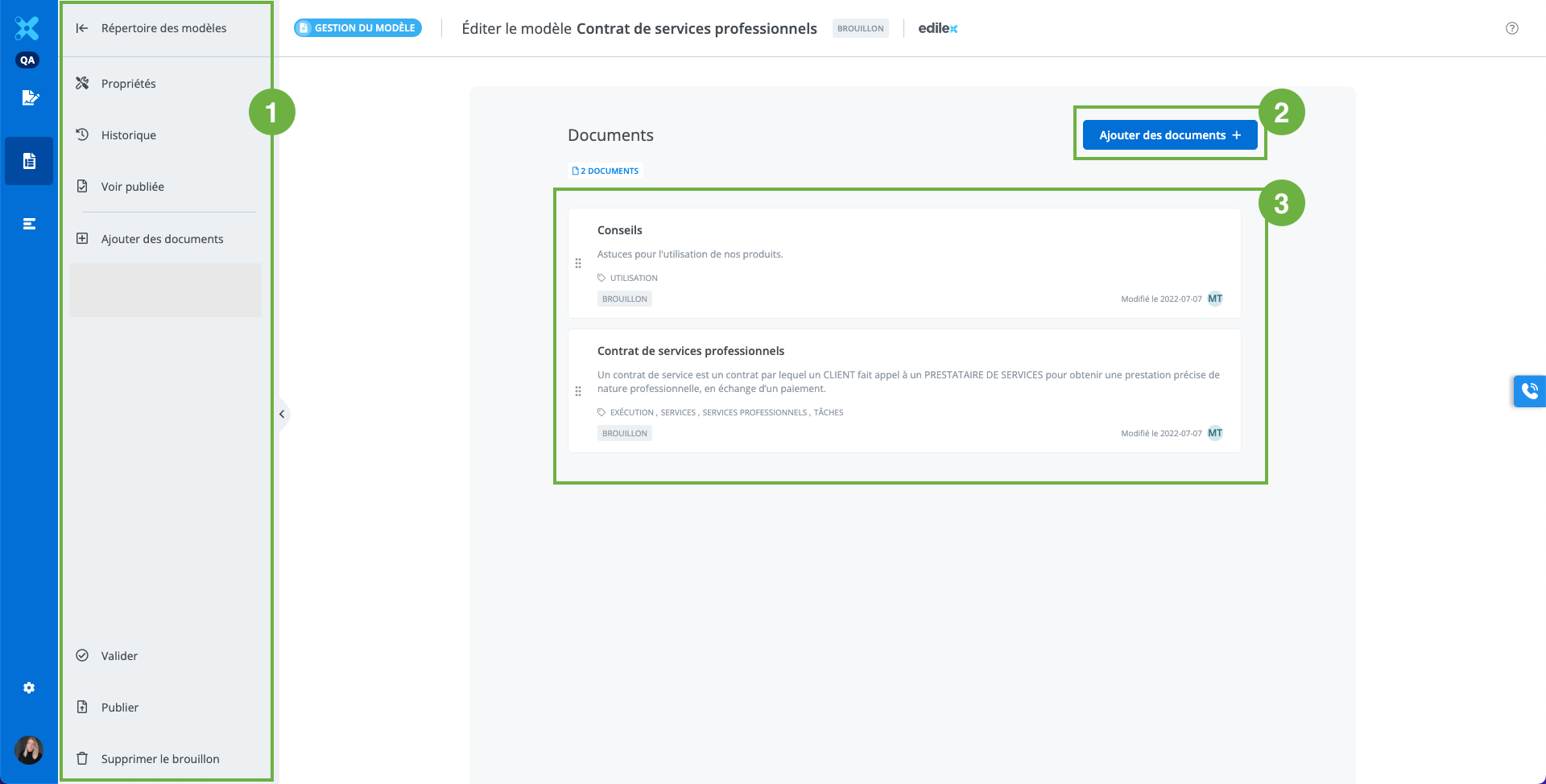 Il est possible de modifier l’ordre d’apparition des documents dans le modèle. De cette manière, l’ordre établi sera le même pour tous les documents rédigés à partir de ce modèle. Déplacer les tuiles de documents à l’aide du glisser-déposer.