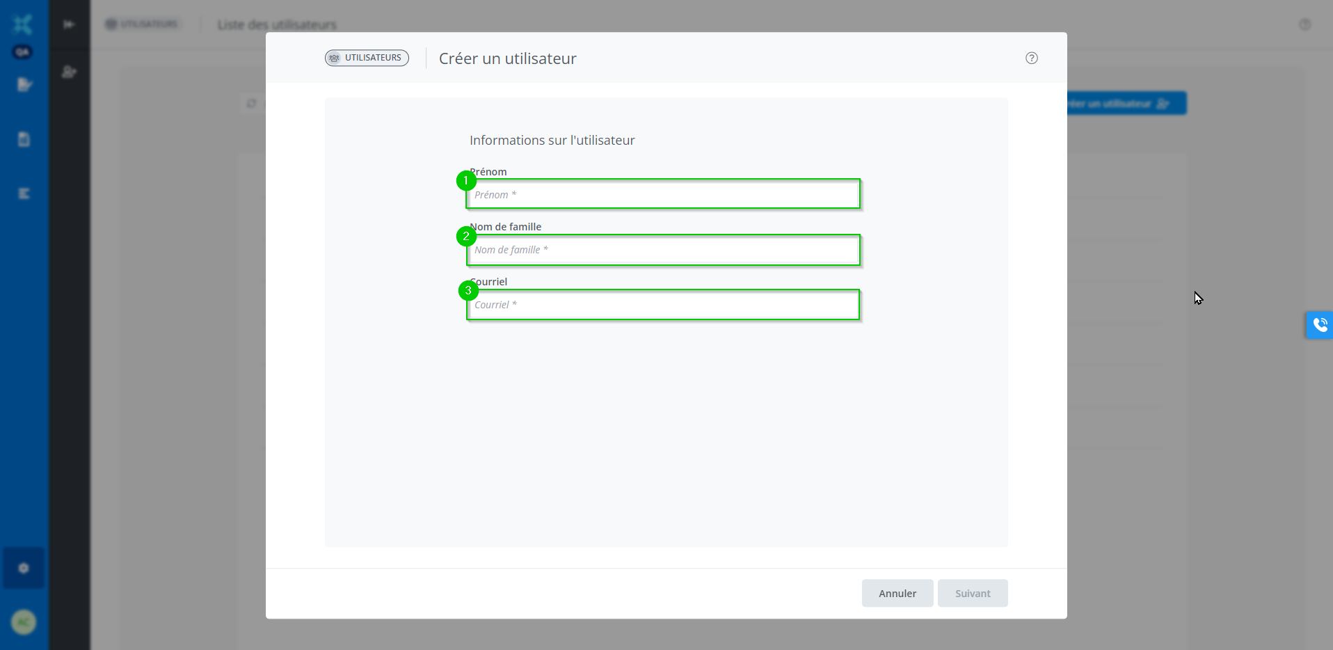 Depuis la fenêtre des Utilisateurs, cliquer sur Créer un utilisateur (1).