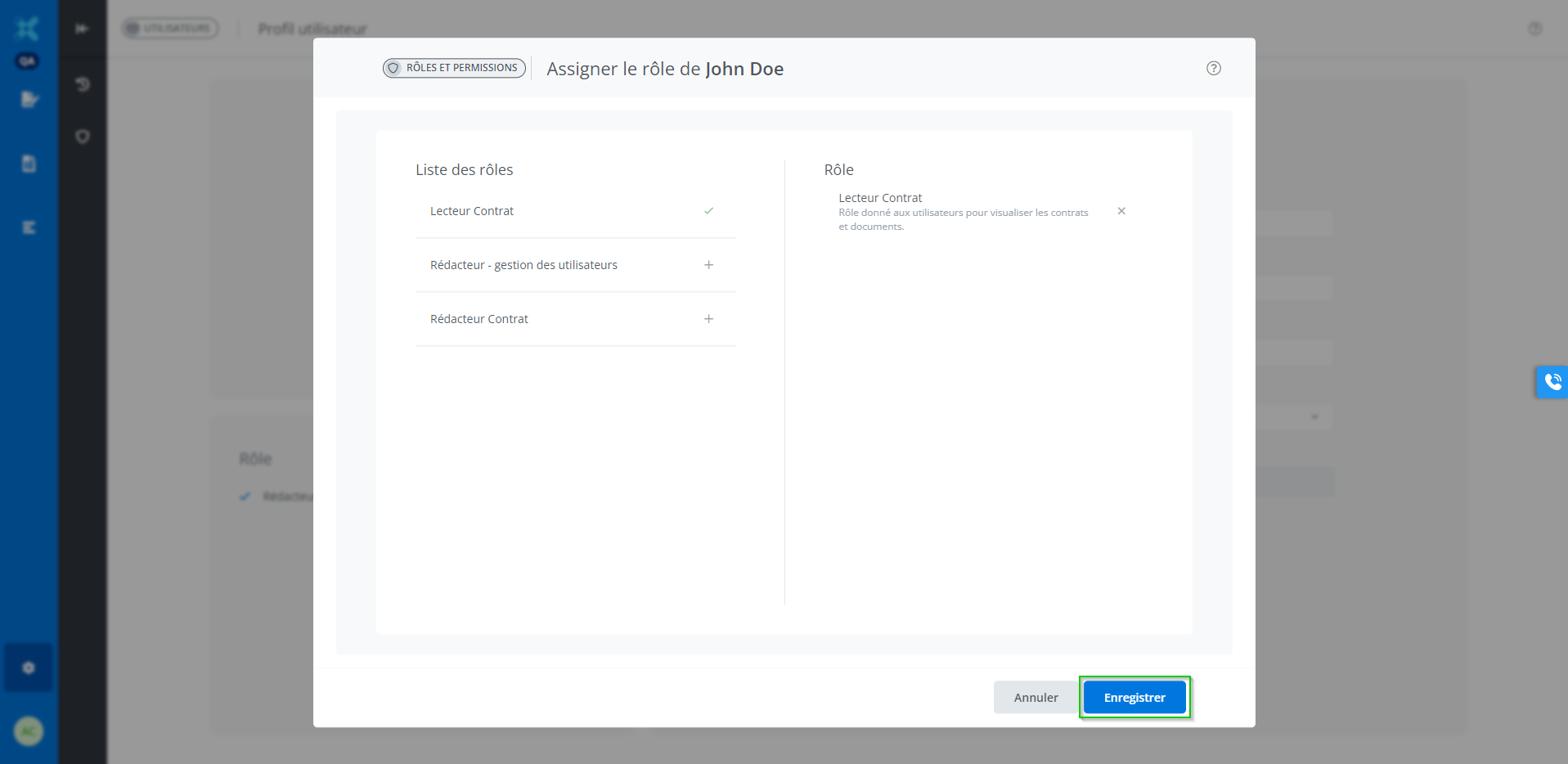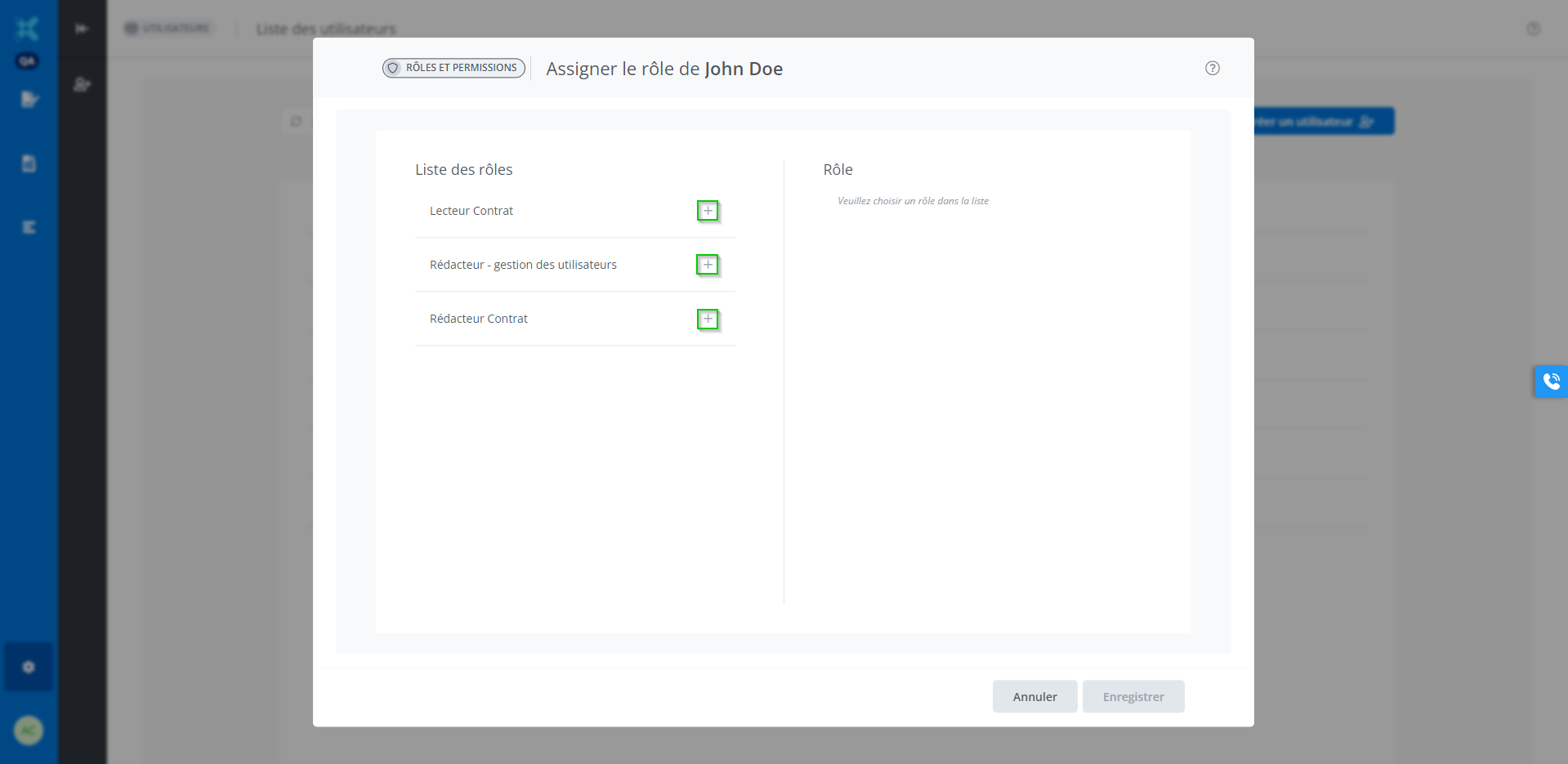 Cliquer sur le bouton “+” correspondant au rôle approprié pour l’utilisateur.