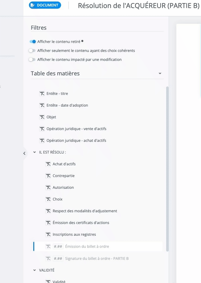 Certaines actions, comme la sélection d’une alternative, le retrait d’une clause ou d’un paragraphe, entraînent donc des modifications dans le document, comme l’ajout, le retrait de contenu ou la sélection d’une alternative. Lire l’article suivant pour en savoir plus sur la manière de voir les impacts d’un choix fait dans le document.