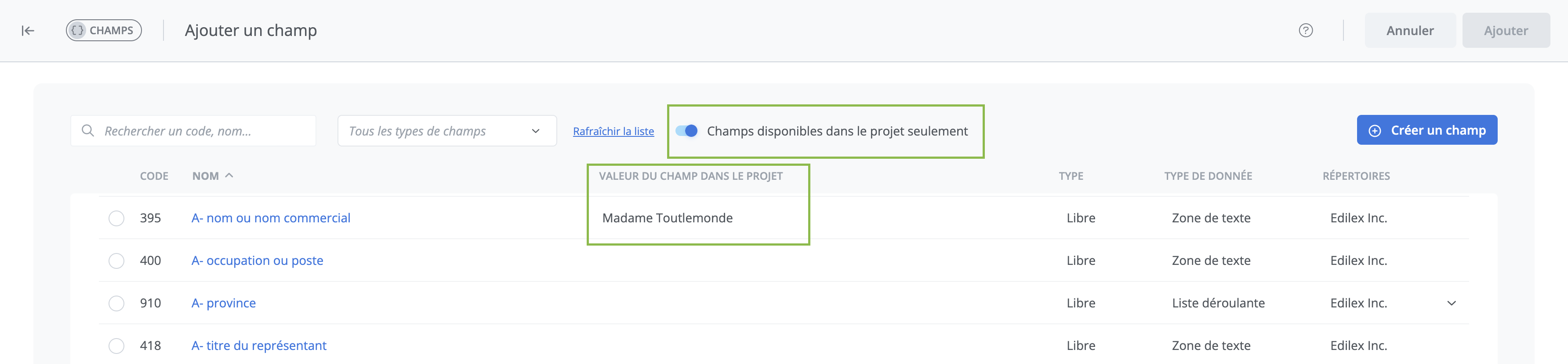 Vous pouvez maintenant utiliser un filtre «Champs disponibles dans le projet seulement». De cette manière, vous êtes certain d’ajouter un champ lié au projet. Il est même possible de voir la valeur du champ que vous avez saisie dans le projet afin d’avoir la certitude qu’il s’agit du bon champ.