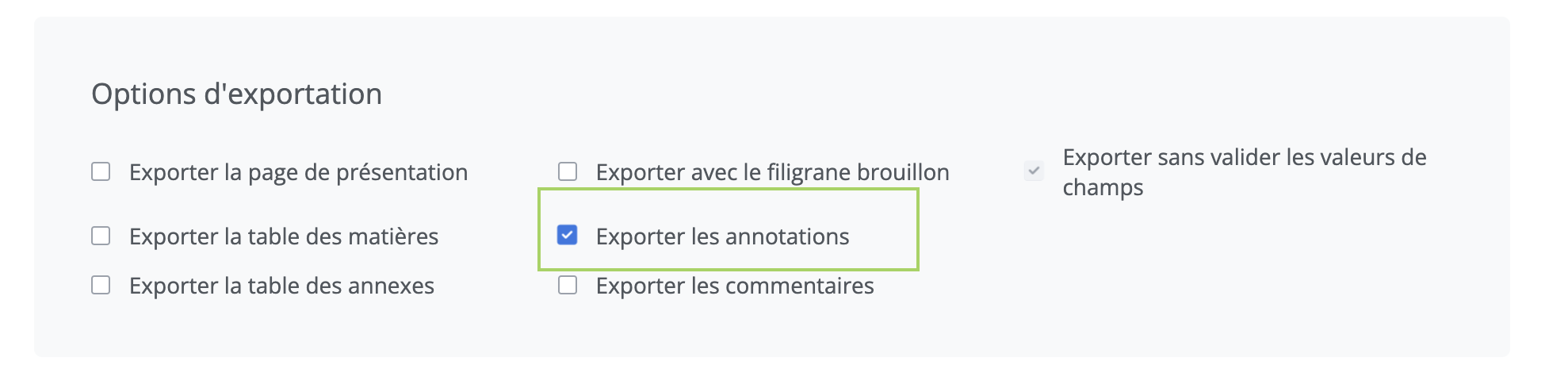 Il est aussi possible d’exporter les annotations à partir du panneau d’exportation en cochant l’option Exporter les annotations.