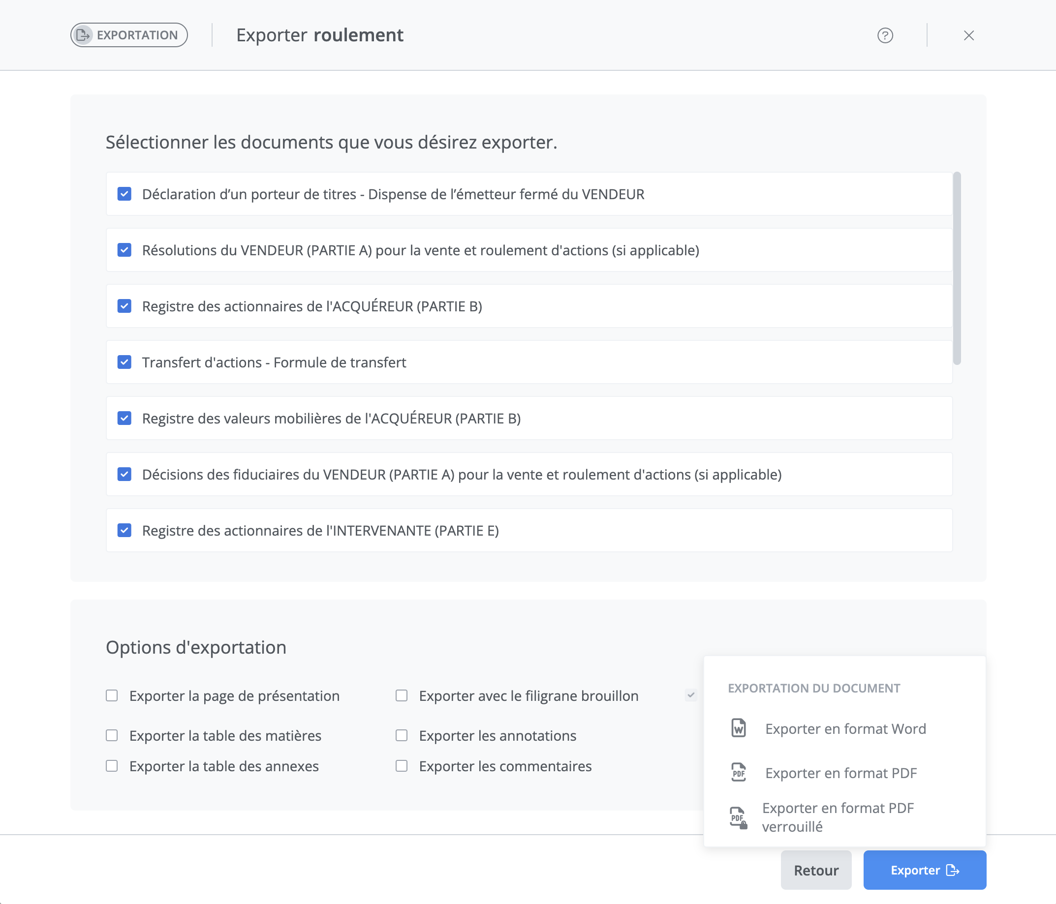 Il suffit de cliquer sur le bouton Exporter la trousse, sélectionner les documents à exporter, les options désirées et le format de sortie des documents pour télécharger l’ensemble de vos documents dans un format compressé (.ZIP).