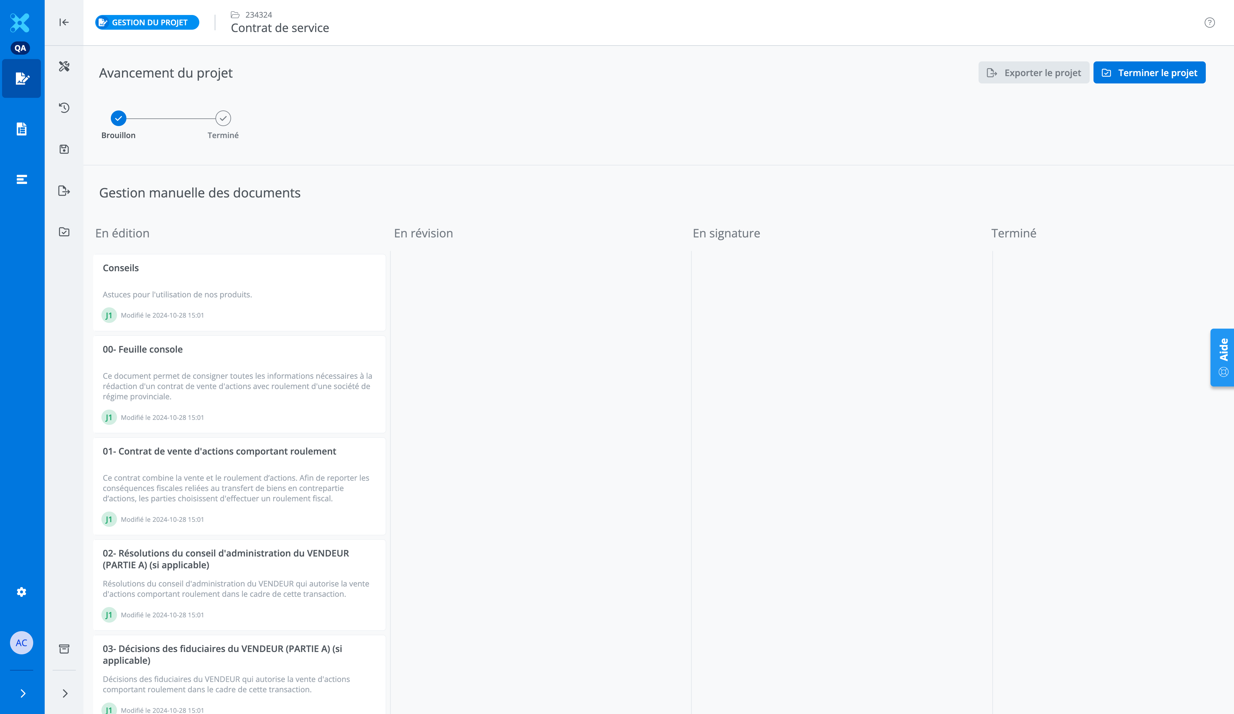 Cette nouvelle approche repose sur plusieurs améliorations clés. Une barre de progression dynamique vous permet de visualiser clairement l’avancement de votre projet selon les actions effectuées. Une refonte des boutons d’action et des libellés assure une meilleure compréhension des étapes essentielles et des différentes versions des documents contractuels. Finalement, la gestion manuelle des documents avec défilement horizontal facilite la lecture des statuts, même pour les projets les plus complexes.